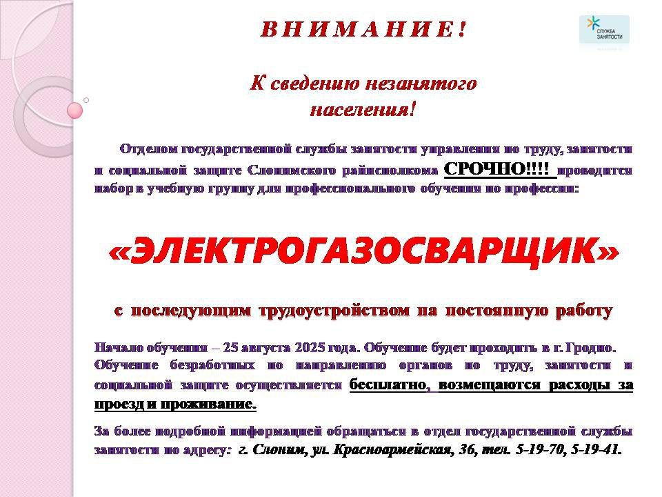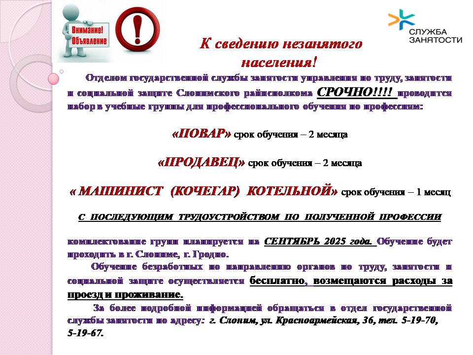 Наиболее актуальными для семей являются индивидуальные услуги кратковременного ухода за детьми. Развитие таких услуг целесообразно осуществлять в системе социального обслуживания с учетом уже имеющейся практики оказания услуг по уходу за детьми (услуг няни) при рождении двойни (тройни и более детей), воспитания ребенка с инвалидностью. В качестве пилотного проекта возможно рассмотреть оказание на платной основе услуги няни: ---семьям, воспитывающим двоих и более детей, родившихся одновременно, детей-инвалидов до 3-х лет, сверх установленного норматива обеспеченности услугой; ---семьям, в которых воспитывается двое и более детей в возрасте до 3-х лет (дети-погодки); ---семьям, в которых мать вышла на работу до окончания отпуска по уходу за ребенком в возрасте до 3-х лет и другое лицо не осуществляет уход за ребенком; ---другим категориям семей, воспитывающим детей до 3-х лет, нуждающимся в услуге няни. ТЕЛЕФОНЫ ДЛЯ СПРАВОК: 8 (01562) 6 64 90, 6 64 93.4 ноября в рамках месячника «Человек с белой тростью» в г. Слониме прошла информационная акция «Правила общения с незрячими» среди работников сферы обслуживания."